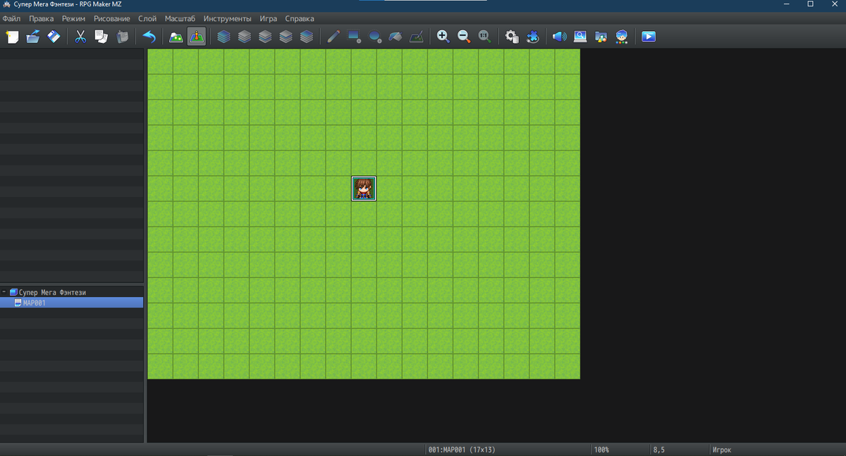 Во-первых, опустело окно с миниатюрами графики, что немудрено, режим-то выбран другой – теперь здесь будет список наших ивентов. Во-вторых, карту разлиновало стандартной мукерской сеткой, а в третьих рахит-герой в центре из полупрозрачного стал вполне таким ярким и осязаемым. Это происходит потому, что герой в данном случае является точкой Начального Положения Игрока.