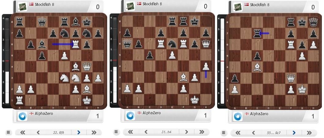 Это просто какие-то невероятные трёхмерные космические шахматы! Никогда в жизни ни один игрок в здравом уме, кроме совсем уж зеленых оболтусов, не поставит белую ладью в такую уязвимую позицию на F6, где её легко поймать в капкан и взять отдав максимум пешку! Слева, белая полоска оценка силы позиции. Соотношение 3 к 5 не в пользу белых, но их это нисколько не смущает. Эта зараза ещё и издевается! И через 9 ходов ставит вторую ладью в такую же неудобную позицию для атаки, впритык к черным пешкам. Тарраш в ту же секунду устарел со своим "ладью следует ставить позади пешки, всё равно - своей или неприятельской". На скрине 3 уже пинание дохлого врага. Ладьей и пешкой выключен из игры целый фланг черных во главе с ферзем и их король в безнадежной ситуации, а на другом фланге подавляющее преимущество белых. Человек бы давно уже сдался, но StockFish же чемпион! Да и не умеют машины сдаваться. Нейросетки - офигенный прорыв в теории игры. Где нет никаких правил, нет "верха и низа", неважно мате