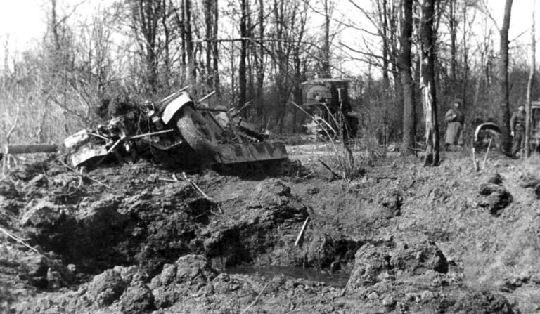 The results of the Russian air strike to the defensive positions of the German Wehrmacht in East Prussia, Third Reich.