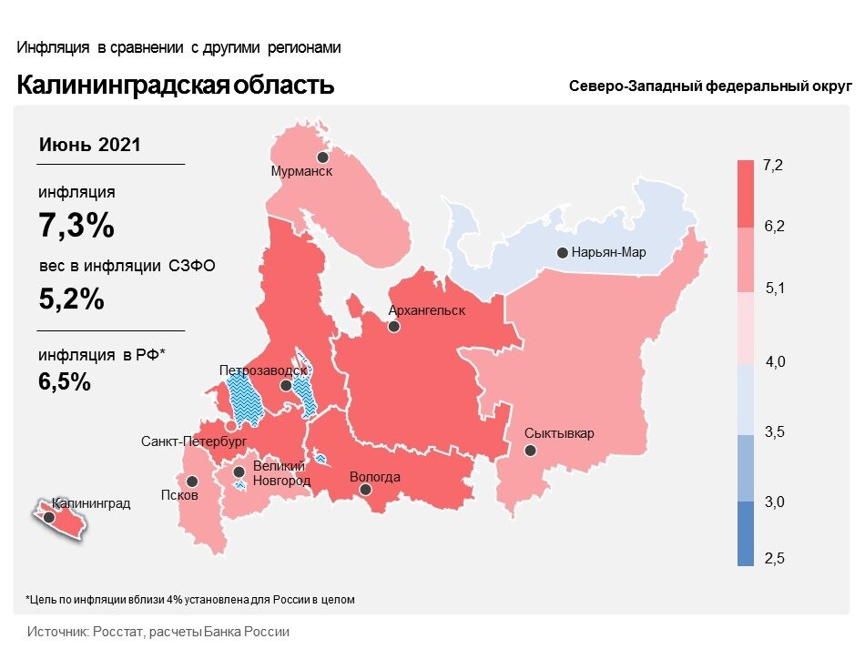 Годовая инфляция в Калининградской области в июне 2021 года возросла до 7,25% после 7,04% в мае. Годовой темп прироста цен в регионе сложился выше, чем по Северо-Западному федеральному округу (6,61%) и по России в целом — 6,50%. Динамика инфляции в регионе была определена ростом издержек производителей, расширением спроса на отдельные непродовольственные товары и услуги, а также эффектом низкой базы прошлого года на отдельные платные услуги населению. Продовольственные товары Годовой прирост цен на продовольственные товары в июне снизился до 8,31% после 8,75% месяцем ранее. Благодаря наращиванию объемов продукции местного производства замедлились темпы прироста цен на яйца, молоко, сметану и сливочное масло. Благоприятные погодные условия в странах-производителях способствовали увеличению в этом году весеннего сбора урожая чая, в результате темпы прироста цен на чай в годовом выражении замедлились, рассказали в отделении по Калининградской области Северо-Западного главного управления Ц