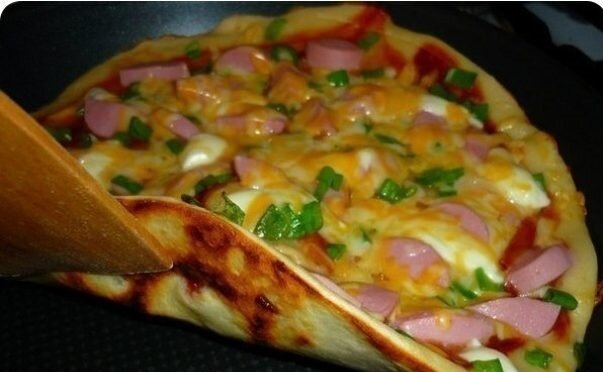 Пиццу можно приготовить и на сковороде! Такую пиццу можно приготовить даже на завтрак. Обязательно приготовьте такую пиццу дома! Ингредиенты: Количество порций: 5-6 Как приготовить 1. В большой миске смешайте муку, сметану, соль, перец. Вбейте яйцо. Должно получиться жидкое тесто. 2. Вылейте тесто в разогретую на средне-высоком огне сковороду с растительным маслом. 3. Когда тесто слегка затвердеет, добавьте кетчуп. 4. Посыпьте тертым сыром. 5. Выложите нарезанную кубиками колбасу. 6. Добавьте рубленную зелень. 7. Накройте крышкой, огонь понизьте до среднего. Как только сыр расплавится, а тесто станет твердым, пицца готова! Пицца с колбасой на сковороде готова! Приятного аппетита!