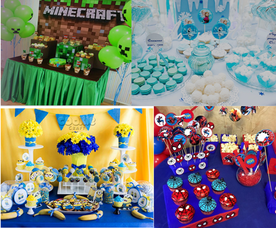 Традиция "Candy-bar" или по-нашему, сладкого стола, пришла к нам с Запада и успешно прижилась на свадьбах, детских праздниках и корпоративах. От просто "сладкого стола" "Candy-bar" отличает большое количество декоративных элементов и кондитерский шик. В этой статья поговорим о детских кенди барах (дальше обозначу КБ) Тематика и цветовая гамма Итак, стол обязательно должен вписываться в тематику праздника. Можно поискать вдохновения в интернете, или пофантазировать. Бывают candy bar: После того, как определились с тематикой праздника, нужно будет подобрать набор для оформления КБ в этой тематике. Его можно бесплатно скачать, а потом напечатать на цветном принтере, либо заказать дизайнеру (например на "ярмарке мастеров"). В такой набор обычно входит: Фон, скатерть Фон может быть из шаров, атласных лент или ткани, дополнительно украшен гирляндой или цветами (бумажными или живыми). Часто здесь размещают гирлянду " С днем рождения". Скатерть выбираем в тематике праздника, ну или как мин