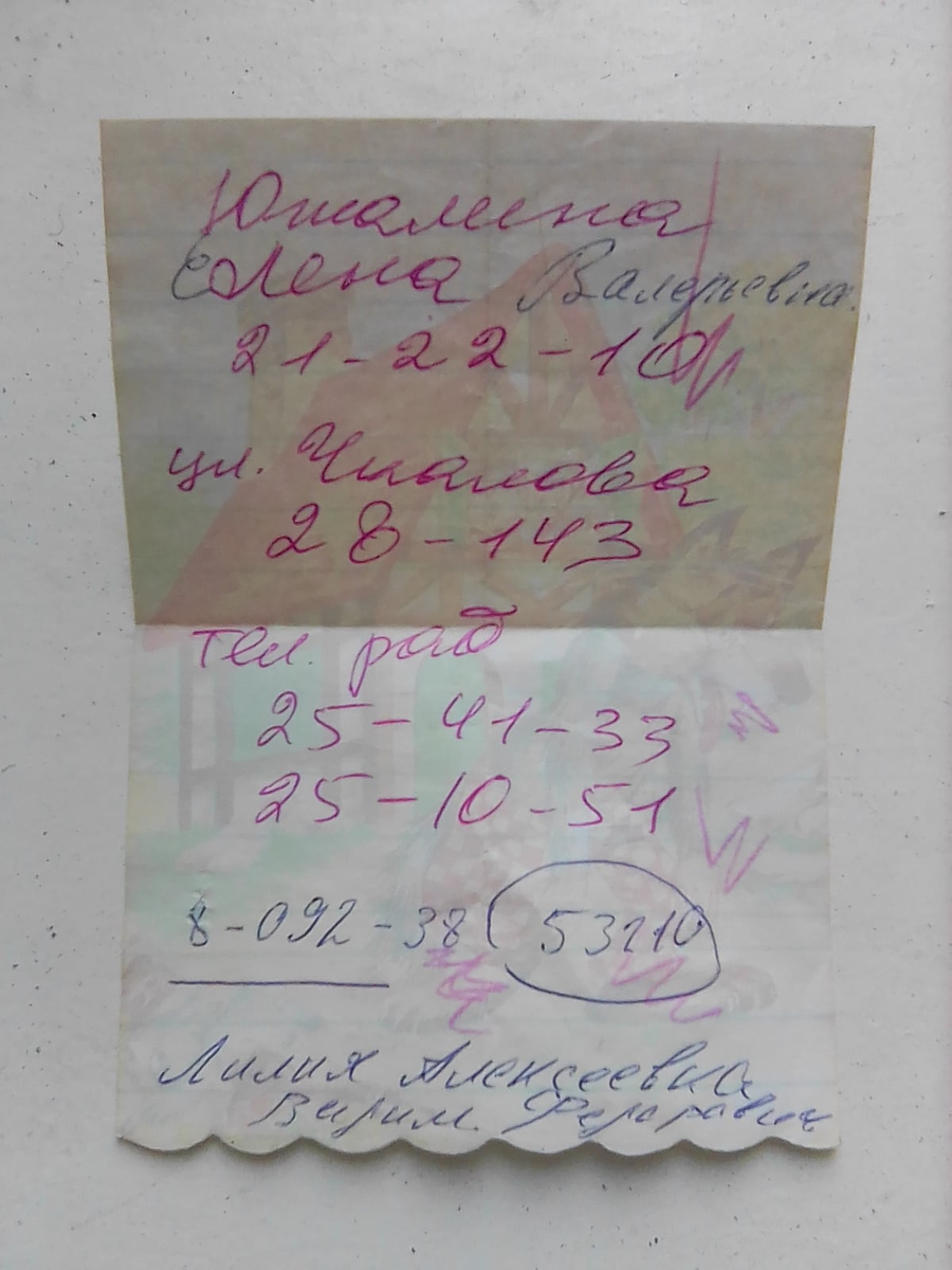 При помощи этой записки женщина, известная мне как Елена Валерьевна Повышева сообщила мне свои новые координаты и неизвестную мне ранее, но с ее слов принадлежащую ей фамилию, Южалина, возникнув в моей жизни после двадцатилетнего перерыва. Листочек она вырвала из блокнотика, на записке два почерка (внизу синей ручкой уже дописывала я). Я никогда не видела подлинного паспорта на имя Южалиной Елены Валерьевны.