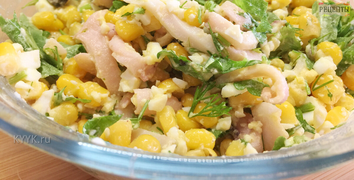 Это очень простой, быстрый и легкий рецепт. Дольше всего в приготовлении салата варятся яйца.)) Ингредиенты и видео рецепт в конце статьи. Пошаговый рецепт. Морской коктейль слить, выложить из банки. При желании кальмаров и осьминогов можно порезать. Яйца мелко нарезать, добавить к коктейлю. Кукурузу слить и добавить в салат. Зелень вымыть, обсушить и мелко нарезать. Руколу добавлять по желанию и столько, сколько хотите. Немного посолить. Перемешать. Я не делаю никакой дополнительной заправки, мне нравится именно так. Но вы, конечно, можете заправить салат по своему вкусу. Салат готов! Ингредиенты: Морской коктейль (в масле или в рассоле) – баночка 450 гр., масло/рассол слить. Яйца вареные – 3 шт. Кукуруза – 1 банка Зелень: петрушка, кинза, укроп – по 1- 2 веточки каждой Соль – по вкусу Рукола – по желанию. Видео рецепт. Приятного аппетита! Если было интересно – ставьте лайк. Приглашаю вас подписаться на канал «Рецепты», будет еще много вкусного!)) Читайте также: Говядина в сливк