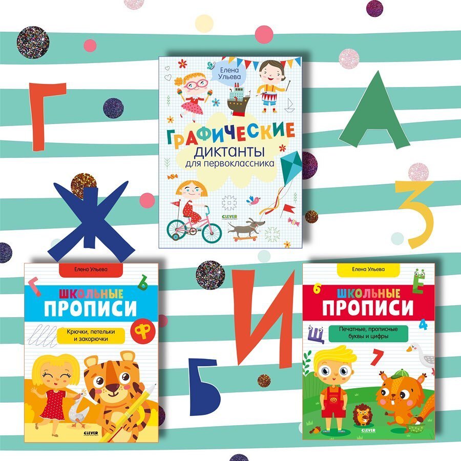 В издательстве Clever выходят три пособия для подготовки к школе или для занятий в первом классе: Эти пособия позволяют легко и в увлекательной форме подготовиться к школе, совершенствовать навыки письма у первоклассников, вспомнить и закрепить полученные умения. Все новинки уже появились на сайте издательства и во всех интернет-магазинах! Пособие «Графические диктанты для первоклассника» — настоящая находка для родителей младшего школьника! Особенно если он неусидчив или у него не получается рассчитывать место в тетради. В этой книге 20 графических диктантов, которые просто незаменимы в общем развитии ученика начальной школы. А еще здесь есть 20 упражнений на симметрию и любимые задания детей — «найди отличия» и лабиринты. Выполняя их, ребенок будет развивать моторику, логику, внимание, воображение, учиться ориентироваться на листе бумаги и в пространстве. Получая столько пользы, первоклассник не будет скучать. Ведь так весело рисовать линии, следуя стрелочкам, и шаг за шагом выводи