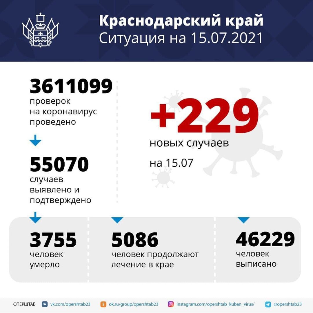 В Краснодарском крае за сутки зарегистрировали 229 заболевших коронавирусом