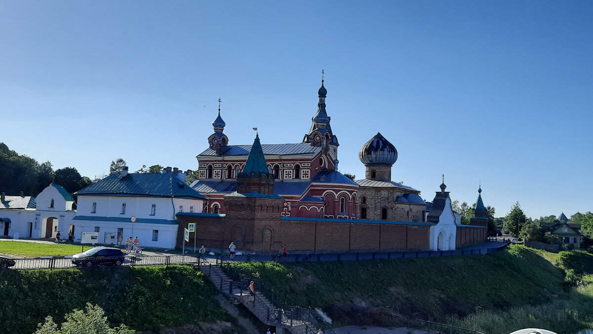 Утром, в начале десятого, швартуемся к причалу, который находится прямо напротив похожего на старинный кремль или сказочный посад Никольского монастыря. Люди с интересом осматривают окрестности. В 10 утра на высоком холме у входа в монастырь собираются три группы нашего теплохода.