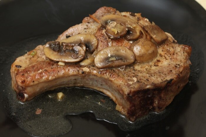 Ингредиенты на – 5 порций Свиное филе - 400 гр Грибы белые - 70 гр Лук репчатый - 70 гр Сыр твердый - 75 гр Масло растительное - 3 ст.л. Мука пшеничная высшего сорта - 1.5 ст.л. Соль - по вкусу Перец черный молотый - по вкусу Как приготовить "Свинина, запеченная с грибами" 1) Нарезаем грибы и лук. Обжариваем до золотистого цвета, затем вливаем полстакана воды и тушим минут 30 до готовности грибов. 2) А этим временем подготовим свинину. 3) Нарезаем на 5 кусков. 4) Отбиваем с двух сторон. 5) Солим и перчим,затем панируем в муке. 6) И быстро обжариваем на масле. 7) Затем на каждый кусок кладем по чайной ложке лука с грибами. 8) Сверху посыпаем тертым сыром. И ставим запекать в духовку при 180С минут 8-10. Рецепт "Свинина, запеченная с грибами" готов, приятного аппетита ;)