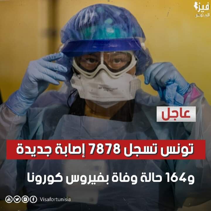 В Тунисе зарегистрировано 7 878 новых случаев заражения и 164 смерти от коронавируса за последние 24 часа.