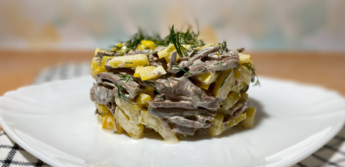 Простой, но очень вкусный, нежный, сочный салат с сердечками. Я делала с индюшачьими сердечками, но можно, конечно, и с куриными. Так же сердечки можно заменить на печень, тоже будет довольно интересный вкус. Ингредиенты: сердечки 400 г 1 лавровый лист перец горошком 3 -4 шт. половинка луковицы половинка стебля сельдерея (можно пропустить) 2+2 зубчика чеснока 1 большой болгарский перец нарезанный укроп для подачи соль по вкусу Приготовление: Сердечки промыть, положить в кастрюлю и залить холодной водой, довести до кипения на сильном огне, снять пенку. Убавить огонь, посолить бульон, добавить в него лавровый лист, перец горошком, 2 раздавленных ножом зубчика чеснока, половинку луковицы, сельдерей. Варить сердечки до мягкости, примерно 1,5-2 часа. Сердечки должны получиться очень мягкие и при разрезе не должно быть крови. Вынуть сердечки из бульона, остудить. Сердечки и болгарский перец нарезать соломкой, 2 зубчика чеснока мелко порубить. Сложить все в салатник, посолить по вкусу и хоро