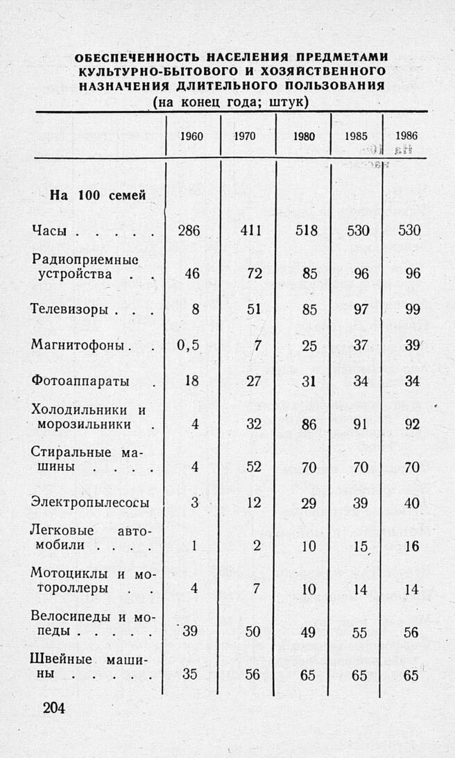 Отчётность советского времени из справочника "Весь СССР за 1986 год." Верить ли официальной статистике, дело Ваше, я человек "верующий". Начну с грустной темы. Итак, на 1986 год в сберегательных кассах граждане хранили 242,8 миллиарда рублей. Люди копили детям на свадьбу, на 18-летие, на старость и тд. Государство им эти деньги "простило". Теперь посмотрим, как был обеспечен советский человек материально-бытовыми ценностями. Почти в каждой семье есть телевизор, холодильник и стиралка. Интересная статистика. "На 100 семей". А если посчитать в людях, то картина уже не такая радужная. Ниже будет таблица обеспеченности на 1000 человек. Следующая таблица тоже очень интересная. Дана в процентах. И выглядит довольно неплохо. В 1986 году колхозник получал на 800% больше, чем в 1940 году! Кажется, что колхозник миллионер, но это не так. Посмотрите второй документ в галерее, Вы увидите трудодни и зерно за них, которыми оплачивался труд колхозника в 1940 году. С образованием в Союзе всё было х
