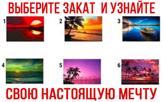 Тест на тип личности по закату вашей мечты поможет определить ваши реальные мечты и жизненные приоритеты. Достаточно просто выбрать наиболее понравившуюся картинку. 1. Гармония и душевное спокойствие Все страсти и переживания вы оставили далеко в прошлом. Ваша жизнь размеренна и предсказуема. Вы цените свою работу, окружение и не намерены ничего менять. Боитесь рискнуть, и что-то изменить в своей жизни, ведь тогда, вы можете потерять то, что есть на данный момент. Вы давно разучились мечтать, привыкли довольствоваться малыми крупицами счастья, и за это благодарить судьбу. 2. Семейное гнездышко Ваша семья – главная опора и поддержка в жизни. Без них вы не представляете своего существования. Тест на личность характеризует вас, как очень боязливого человека. Вам страшно предпринимать любые шаги самостоятел
