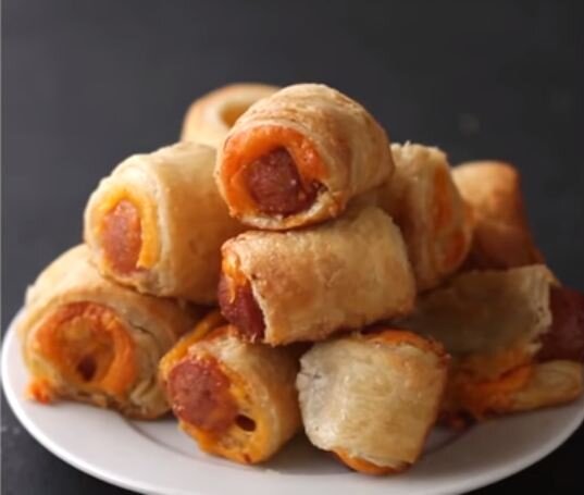 Это быстрый и очень вкусный рецепт всего из простых ингредиентов. Для сытного завтрака — само то! Привет, друзья, всем хорошего настроения! Это блюдо делается н скорую руку из простых продуктов в вашем холодильнике. Наверное иногда хочется по разнообразить и к утреннему чаю подать не бутерброды, а красивую и необычную всякую всячину. Для приготовления микро хот-догов нам понадобятся: И так, начинаем. Берем порезанное слоеное тесто и раскладываем на досточке или столе. На тесто сверху кладем сыр. Можно любой сыр использовать, на ваше усмотрение. Далее, сверху сыра укладываем сосиску. Аккуратненько плотно все это дело заворачиваю в рулон. Получилась сосиска в "одеяле". И так делаем с остальными сосисками, чтоб всем хватило. Затем нарезаем эти рулоны на 3 или 4 части, как вам нравится. Получились у нас вот такие маленькие хот-доги. Далее выкладываем заготовки на противень. Противень нужно застелить бумагой и смочить маслом, чтобы не пригорало. Отправляем наш будущий завтрак в духовку и с