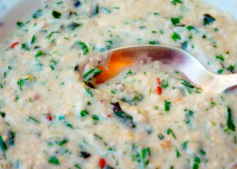 Я уже стала привыкать к жаре. И даже находить в ней свою прелесть. Ну, судите сами: А теперь вот мы с матушкой добрались и до каш. Точнее, для тех их стратегических запасов, которые приобретались для пёсов, но так и стояли невостребованными (овсянку имею в виду), ибо наши собаки любят гречку и рис и совсем не понимают "вот эти липкие комочки". Действительно, молочная каша с утреца - тяжеловато, а на воде - пустовато! Но щэ николы такого нэ було, щоб вьетнамци здавалыся... Пошерстив по недрам уже холодильника, я обнаружила довольно приличное количество зелени и жалкий полушмяк маленького кружка моцареллы. Ну так ведь для первого раза просто отлично! 1/2 стакана быстрорастворимой овсяной крупы 1,5 столовых ложки смеси измельченных свежих листьев базилика, укропа и петрушки 1 столовая ложка мелко натертой моцареллы (можно и больше) 1 чайная ложка оливкового или сливочного масла Соль Перец Всё приготовление занимает секунды: Высыпаем в миску с крышкой овсянку, туда же отправляем соль, пер