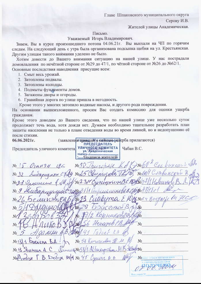 Я обращаюсь к жителям г. Михайловска Ставропольского края и не только. Надеюсь, то о чем я буду повествовать, происходит не только у нас. Я Чабан Виктор Степанович председатель уличного комитета улицы Академическая, также занимаю должность заместителя председателя 1 микрорайона. Написал письмо от имени жителей улицы Академическая на имя главы администрации Шпаковского муниципального округа Серова И.В. о чрезвычайной ситуации в связи с подтоплением. Оно зарегистрировано 07.06.2021. Спустя просроченное по закону время мне пришёл ответ. Люди добрые скажите, что это если не отписка. У нас в городе 9 Микрорайонов. Много времени ушло, на слаженность работы и вот когда нам удалось добиться ежеквартальных встреч с Серовым, он нам обещал на каждый Микрорайон выделять по 2 миллиона рублей в год на неотложные нужды. Это было в 2019 году. Затем наступила любимая всеми чиновниками Пандемия (их перестали беспокоить по пустякам). Естественно обещания были отсрочены. Наконец когда нам с трудом удало
