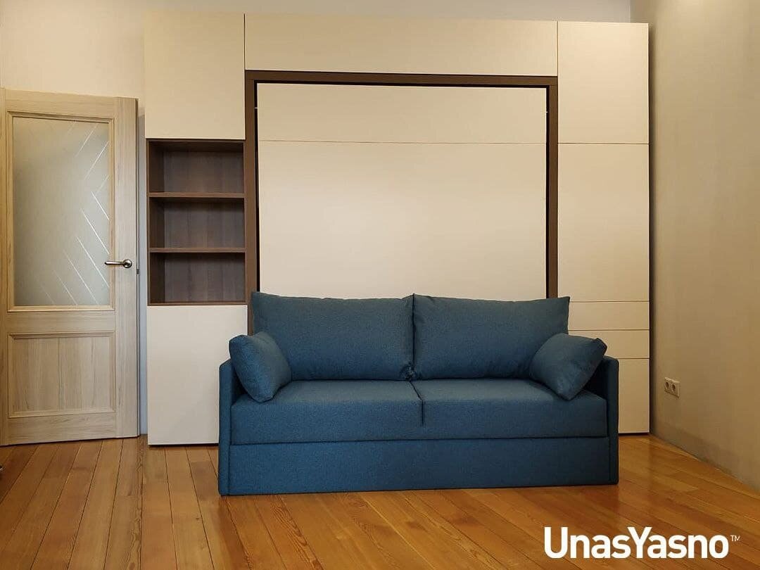 При разработке мебели серии UnasYasno от OLISSYS ™, мы попытались создать простую и функциональную мебель-трансформер, не уступающую по качеству своим аналогам, но значительно дешевле по цене. Шкаф-кровать трансформер выполнен в лучших традициях скандинавского дизайна. Специально создан для самостоятельной сборки и транспортировки. Материалы корпуса и фасадов сделаны из ЛДСП известного австрийского производителя EGGER. Размеры спального места могут быть: 180 см, 160 см, 140 см и 90 см. Система трансформации снабжена комплектом газо-масляных амортизаторов, которые обеспечивают плавное двухступенчатое опускание спального места. Решетка под матрас выполнена из ортопедических амортизационных березовых ламелей. На фото реализованный монтаж комплекта мебели Unas Yasno в который вошли: модуль трансформер, диван, книжный и платяной шкафы, антресоль. Посмотреть все предметы мебели серии Unas Yasno можно на сайте Olissys в разделе каталог.