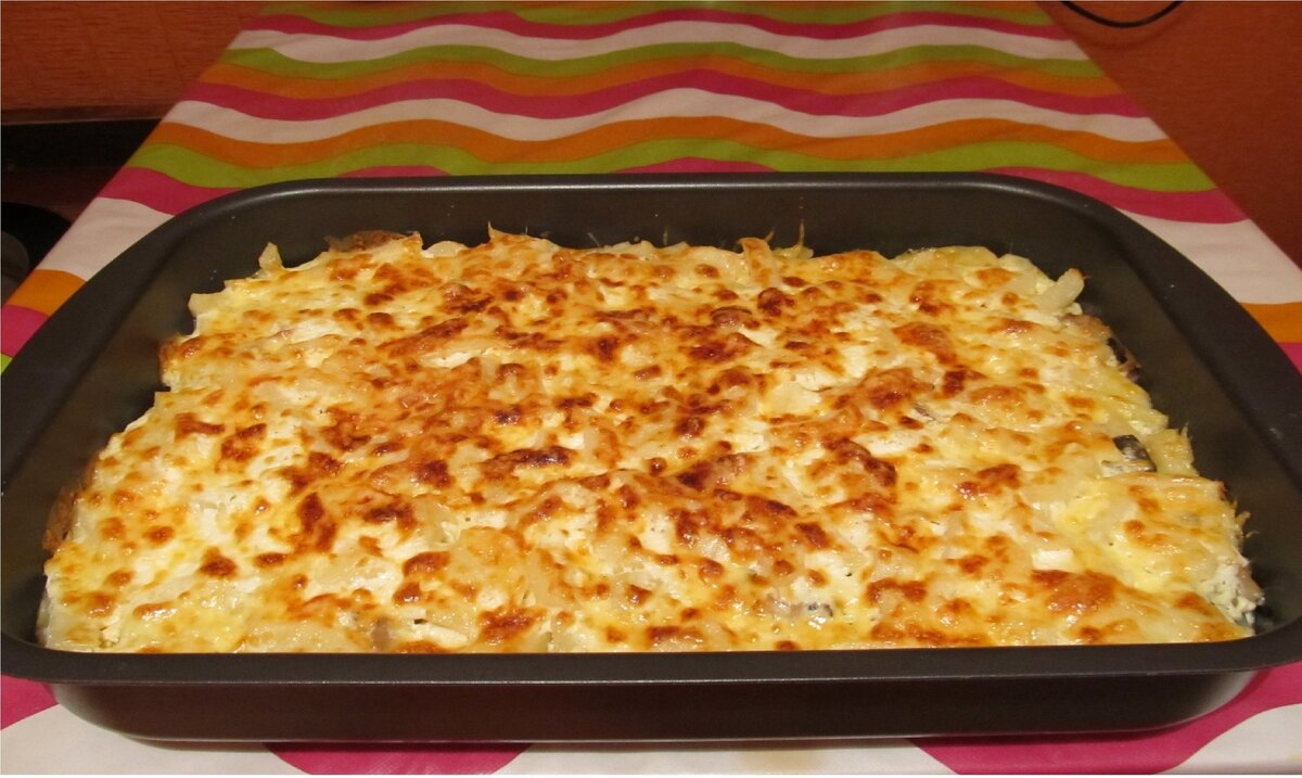 Картофельная запеканка с сыром и белым мясом ( грудка птицы ) .