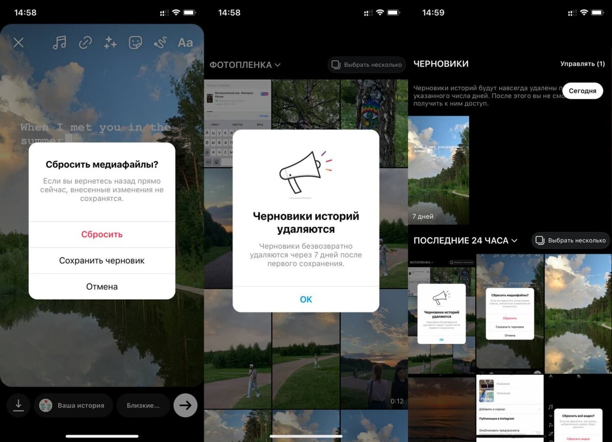 Привет, дорогие читатели. Врываемся к вам в этот понедельник ник с хорошими новостями! Ура в Instagram Stories появились черновики. И это очень круто и удобно! Теперь Stories можно сохранять в черновики, это будет полезно, если вам нужно отвлечься от создания Stories, а затем вернуться к ней. Или наоборот создать сразу несколько Stories, чтобы потом публиковать их в нужное время из черновика уже готовенькими, почти отложенный постинг, но внутри приложения. Также черновики появились в Путеводителях и Reels, а до этого уже были в постах и IGTV, таким образом получается, что теперь черновики есть во всех типах контента в Instagram. Рассказываем про новинки, а заодно и про другие черновики👇 Черновики в Stories Вы можете оформить Stories, наложить текст, музыку и т.д., затем просто попытайтесь закрыть Stories, нажав на крестик в левом верхнем углу — приложение предложит сохранить её в черновик. Все Stories в черновике хранятся до 7 дней. А сам черновик находится в галерее с изображе