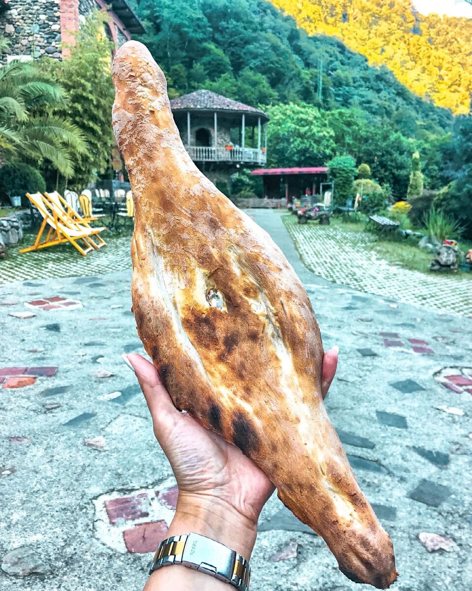 Бывая в Грузии, вы очень часто можете увидеть, как взрослые и дети идут по дороге и кушают хлеб в виде продолговатой лодочки, только что купленный в маленькой пекарне. Мы называем это лаваш, но правильное название «шотис пури» или «шоти пури», а не лаваш👌 Выпекание хлеба в тоне (специальная круглая печь) - это традиция и она до сих пор актуальна☝️ На улицах любого грузинского города можно найти много маленьких комнаток или подвальчиков, в которых до сих пор, шоти печется старинным способом — в печах «тонэ». «Тонис пури» - «хлеб из печи». Форма грузинского шоти вытянутая с отверстием посередине — без него внутри лепёшка превратится в большой пузырь. В давние времена в горшочке «кочоби» хранили «пурисдеда» (мамин хлеб) — тесто с предыдущей выпечки, которое разводили в теплой воде и смешивали с мукой. Тесто созревало в посуде — «варцли», затем разрезали на кусочки — «гунда», выкладывали на доску «ороми». Тем временем, стенки печки раскаляются до 300 С☝️ При такой температуре хлеб не пада