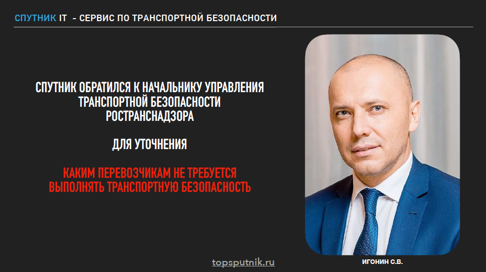 Сегодня разбираем важную тему: “Каким перевозчикам не нужно выполнять транспортную безопасность”. Компания “Спутник” связалась с начальником управления транспортной безопасности Ространснадзора Сергеем Игониным и получила официальный ответ: каким перевозчикам в зависимости от их вида деятельности не нужно выполнять требования 16-ФЗ “О транспортной безопасности”? Не у всех перевозчиков сложилось понимание, в каких случаях обязательно выполнение транспортной безопасности, а в каких ее можно не выполнять. Поэтому давайте посмотрим на комментарий, который предоставил Сергей Владимирович. Во-первых, ответ Сергея Владимировича заключается в том, что транспортная безопасность не распространяется на те транспортные средства, которые используют только для собственных нужд. Перевозчик купил транспортные средства для перевозки пассажиров, но этими пассажирами являются сотрудники его компании, например, это завод или школа, которая перевозит учащихся своими же транспортными средствами. В этом случ