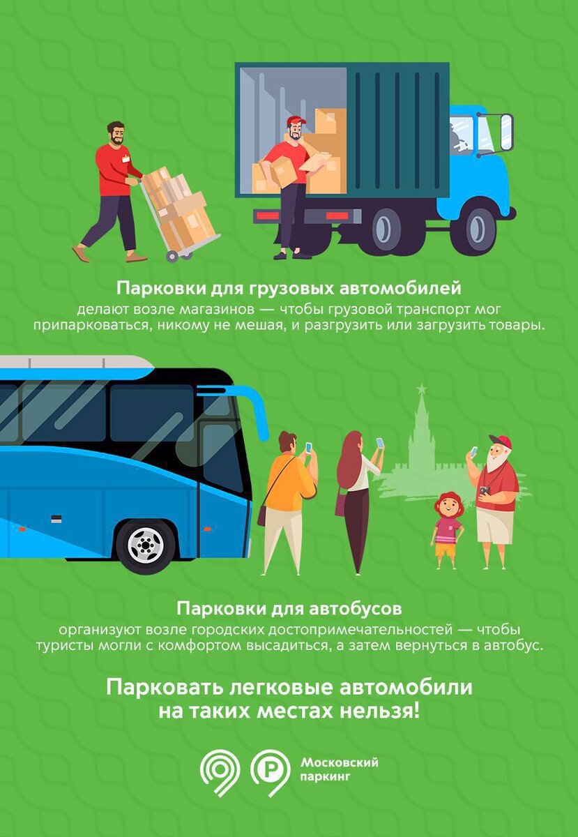 Мы сделали их, чтобы транспорт всегда вовремя доставлял продукты в магазин, а туристы могли безопасно выйти из автобуса на прогулку. Парковки для грузовых автомобилей просто необходимы возле магазинов, чтобы водители могли быстро разгрузить товар. Так мы помогаем обеспечить бесперебойные поставки. У мест для автобусов другая цель — они располагаются у музеев и памятников, чтобы туристам было удобно и безопасно высаживаться. На карточках показываем, как выглядят такие парковки. Пожалуйста, не занимайте их. Полный список мест для грузовиков и автобусов можно найти в мобильном приложении «Парковки Москвы». Для этого в строке поиска на главной странице приложения выберите нужную категорию - «Парковки для автобусов» или «Парковки для грузовиков». Также напоминаем, что для проезда по Москве в дневное время грузовикам больше 3,5 тонн необходимо оформить пропуск на mos.ru. Подробности здесь.
