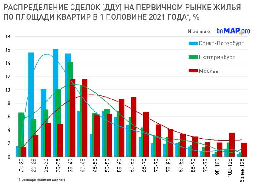 Аналитики bnMAP.pro подвели предварительные итоги по структуре продаж новостроек в 1 половине 2021 года. Программа льготной ипотеки продолжает стимулировать спрос на простое и компактное жилье. Сравниваем три города по структуре спроса в разрезе площадей квартир. Средняя обеспеченность жильем по итогам 2020 года в России составила 26,9 кв. м. Целевым ориентиром для многих государственных программ является средняя обеспеченность жильем в 30 кв. м на 1 человека. С учетом этих цифр, для семьи из 2 человек требуется квартира 55-60 кв. м, для трех - 80-90 кв. м. Количество комнат в квартире должно быть не меньше числа человек в семье. Если квартира не соответствует этой простой формуле, то можно говорить об определенном жилищном компромиссе, недостатке жилой площади и личного пространства. Давайте посмотрим для каких семей строится и продается жилье в трех крупных городах страны, с учетом этого ориентира. Исходя из того, что комфортная квартира для двух человек должна быть двухкомнатной