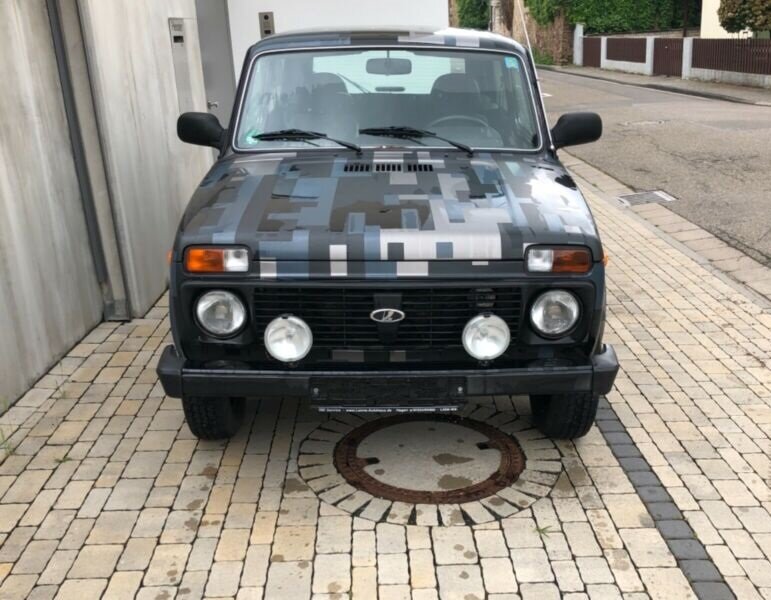 В этой статье покажу НИВУ 2121 экспорт в камуфляже. Не смог пройти мимо данного шедевра и купил. Очень качественная пленка камуфляж. Как выглядит Вы можете видеть на фото. Посмотрите как брутально смотрится НИВА на фоне бетонного забора. На брусчатке видна красотка этой машины. Словно цельный кусок, отлитый из бетона. Эта машина с пробегом всего 20000 км. И здесь много чего переделано, чтобы проходить крутые участки дороги более надежно. Вы будете смеяться, но в Германии этот автомобиль привлекает внимание. Ибо немцы помешаны на военной технике и брутальных вещах. Сама пленка очень высокого качества. Когда стоишь рядом с авто, возникает чувство будто е специально покрасили. Вообще мне очень нравится этот авто, своей неповторимостью. На этой фотографии видно качество исполнения, очень четкие обводы и линии. В живую смотрится будто машина в броне и готова к бою. Как же идеально подобраны цвета и дома и забора. Везде металл и бетон. Естественные природные цвета подчеркивают элементы д