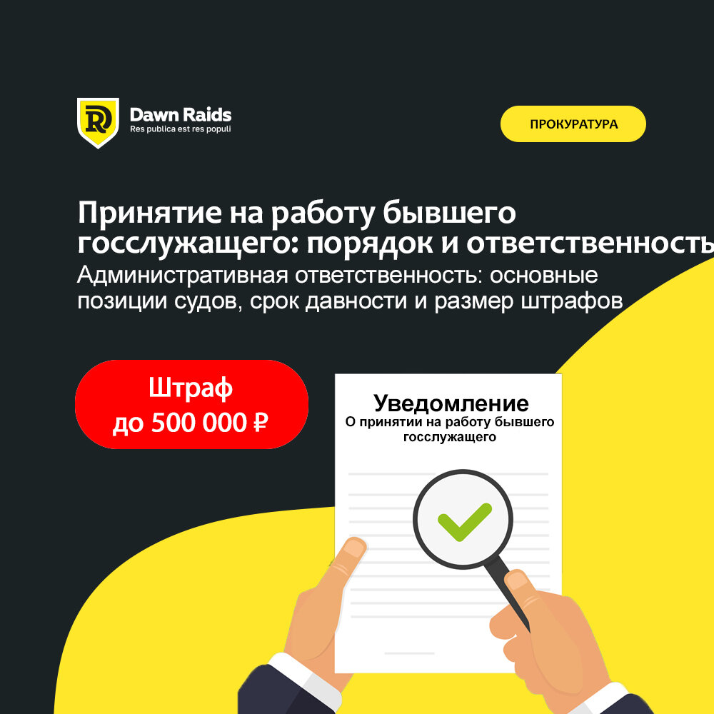📌 Первая часть об общих требованиях к уведомлению здесь, о ст. 19.28 КоАП РФ можно прочитать тут. 🔻Ответственность Статья 19.29 КоАП РФ устанавливает административную ответственность за несоблюдение уведомительного порядка привлечения бывшего госслужащего по трудовому договору (ТД) или ГПХ. 🔻 Административное наказание — штраф: Проводит проверку и возбуждает постановление прокуратура (ч. 1 ст. 28.4 КоАП РФ), а рассматривают суды общей юрисдикции (ч.ч. 1, 3 ст. 23.1 КоАП РФ). Напоминаем, что назначение административного наказания юрлицу не освобождает от ответственности должностное лицо и наоборот (ч. 3 ст. 2.1 КоАП РФ). Прокуратура активно пользуется этой нормой, поэтому все разговоры о субъекте МСП, незнании и назначении штрафа только должику закончатся ничем. Самое неприятное в этой статье — срок давности, он составляет 6 лет и наступает по истечении 10 дней с даты заключения договора. Во многих случаях работник уже давно не работает с организацией или сменилось лицо, подписавшее