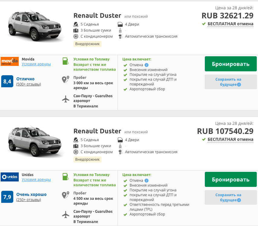 Как ни крути, любители вождения даже в дальнем путешествии хотят быть сами по себе и почувствовать свободу, взяв авто напрокат. Мы уже не раз брали авто в прокатных компаниях в Европе, США и даже Азии, но в Латинской Америке - ни разу. Почитав отзывы и комментарии в интернете, складывается впечатление, что взять машину напрокат в Бразилии сравни игре в подпольном казино Касабланки... Но так ли все сложно на самом деле? Расскажу на конкретном примере авто, которое мы арендовали сегодня, чтобы не быть голословным. Изучив несколько агрегаторов (Economybookings, Rentalcars и т.п.), становится понятно, что ценник практически одинаковый. Выбрали сайт, входящий в холдинг Booking.com - Rentalcars.com, так как уже бронировали авто на нем ранее в других странах и каких-либо проблем не было, есть поддержка на русском языке и дополнительные сервисы. Подбираем автомобиль: Получаем оптимальный вариант для поездок за городом - Renault Duster. Но почему такая разница в цене? Обе прокатные фирмы распо