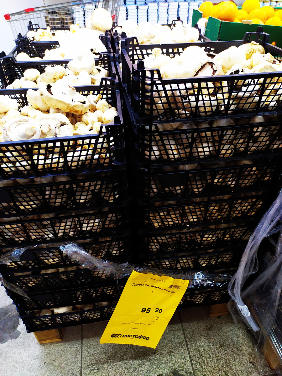 Уже не первый раз в нашем "Светофоре" на выходные запускаются скидки. В прошлый раз продавали напитки, мучные изделия и молочные продукты по цене производителя, а сегодня просто решили снизить цену на 10-20%, на популярные товары. В этом обзоре хочу предложить вашему вниманию товары и новинки, которые я заметила на полках "Светофора" в городе Крымск. Очень крупные свежие грибы шампиньоны, некоторые шляпки диаметром до 10 см. Цена 96 рублей за 1 кг. Мороженая свиная рулька. Цена 110 рублей за 1 кг. Мороженая белобрюхая камбала до 25 см. Цена 100 рублей за 1 кг. Мороженое филе рыбы пангасиус из Вьетнама. Цена 180 рублей за 1 кг. Очень много мороженой форели по цене 345 рублей за 1 кг. В лотке суповой набор из мяса индейки. Цена 79 рублей за 1 кг. Сосиски "Ганноверские", в упаковке 1,2 кг. Цена 139 рублей. Упаковка с полукопчёными "Охотскими" колбасками, массой 500 грамм. Цена 68 рублей. В вакуумной упаковке "Свинина по домашнему". Цена 242 рубля за 1 кг. В вакуумной упаковке полукопчёная