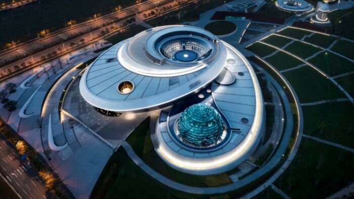 Музей науки и техники в Шанхае открыл миру свой астрономический филиал. Размещенный на площади 390 000 квадратных метров, он оборудован обсерваторией, планетарием, достаточным пространством для выставок и 24-метровым солнечным телескопом. По данным Ennead Architects, он также является крупнейшим в мире музеем астрономии. Помимо того, что этот музей является самым большим в мире, он не похож ни на один другой. Во-первых, нигде на участке вы не увидите прямых линий или острых углов. С самого начала музей хотел заявить о своем масштабе и амбициях, что также во многом отражает амбиции страны. Еще в 2014 году власти музея искали проекты по всему миру от дизайнеров, архитекторов и вот, наконец, выбрали американскую компанию Ennead Architects в качестве знакового проекта. «Здание задумано, как воплощение архитектуры, вдохновленной астрономией», - сказал Томас Вонг, ведущий дизайнер проекта. Фирма называет дизайн праздником временного и пространственного континуума, обеспечивая связь между бог