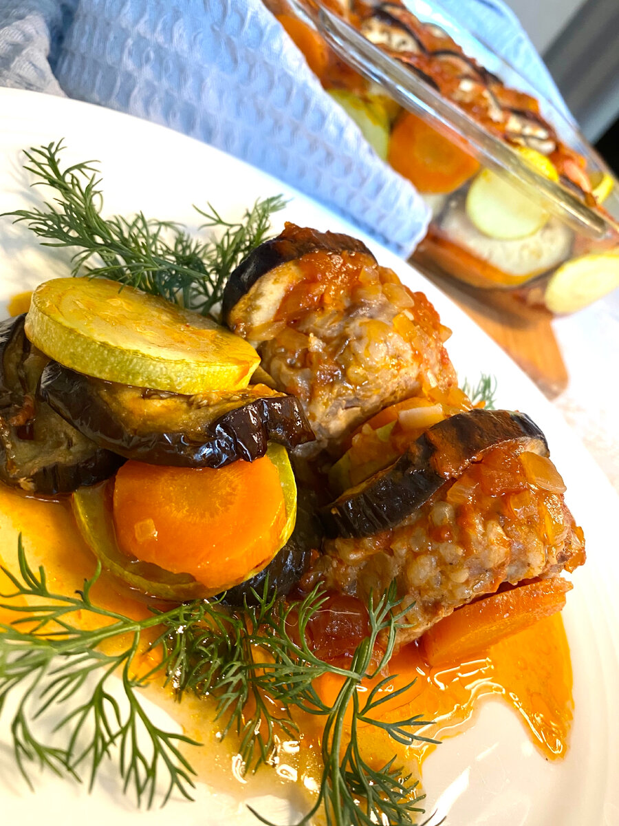 Я готовлю настоящую еду и вкладываю в это душу ! тефтели запеченные с овощами в духовке, получаются очень вкусными ,готовятся вместе с овощами, а это означает что вкусный и полезный гарнир к мясу уже включен в рецепт . Для тех, кто больше любит видео формат, приглашаю на свой канал "Мамины рецепты", где Вы можете увидеть этот видео рецепт пошагово: Ингредиенты; - Фарш 700-800 гр. - рис 200 гр . - баклажаны 2шт. - кабачки 2шт. - морковка 2шт. - лук 2шт. - чеснок 4 зубчика - соль1ч.л. - паприка 1ч.л. - острый перец 1/3ч.л. - чёрный молотый перец 1/2ч.л. - укроп для подачи 4 веточки - подсолнечное масло 50 гр. - томатная паста 2ст.л. К фаршу добавить варенный рис ,соль и специи все тщательно перемешать ,формировать круглые тефтельки . Баклажаны,кабачки и морковку нарезать кольцами по 1-2 см . шириной. На подсолнечном масле обжарить лук нарезанный в мелкий кубик ,добавить томатную пасту разбавленную с водой ,посолить добавить специи и потушить все вместе 4-5 минут Берём колечки
