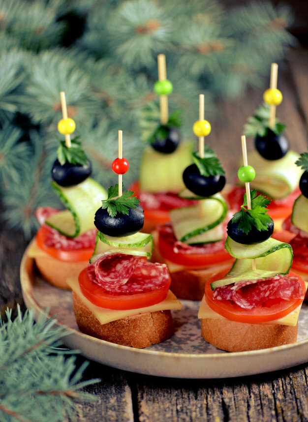 150 г хлеба багета;80г колбасы сыровяленая в нарезке;1 шт. огурца;2-3шт.помидора маленькие;50 г твертого сыра;10 шт.маслин без косточек. Хлет нарезать кружочками толщиной 1 сантиметр.Выложите хлеб в форму для запекания и подсушите его до состояния гренок.Маслины нарежьте пополам ,огурец нарежьте на тонкие ломтики овощечисткой.Помидоры нарежьте кружочками .Сыр нарежьте тонкими ломтиками.Достанте гоенки из духовки,остудите.На гренки для канапе выложите ломтики сыра.На сыр выложите кружочек помидора.На шпажку оденьте половину маслины.Дальше нужно нанизать на шпажку ломтик огурца в виде волны.После огурца наколите на шпажку для канапе колбасу.Шпажку с овощами и колбасой нужно воткнуть в гренку с помидором и сыром -и можно подовать канапе к столу.
