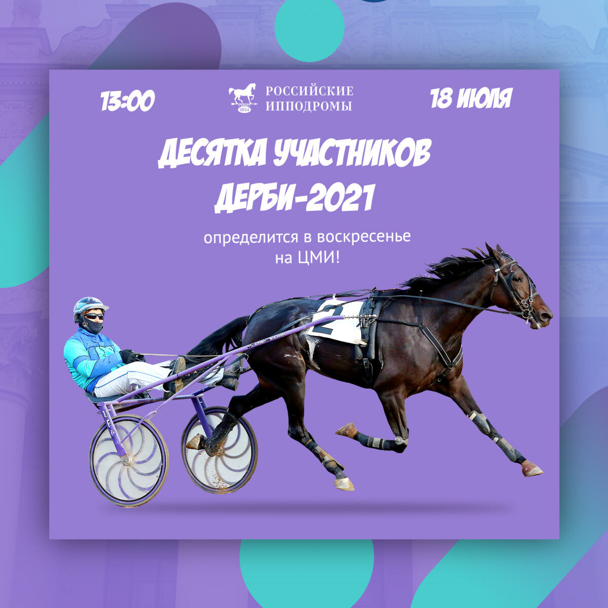 В воскресенье, 18 июля 2021 года, на Центральном Московском ипподроме пройдет день испытаний лошадей, в рамках которого состоится 13 заездов. Главным событием станут полуфинальные заезды Большого Всероссийского приза (Дерби). Отбор участников в таком формате пройдет впервые. Всего для четырехлетних рысаков состоится 5 полуфиналов. Лошади, занявшие 1 и 2 места в каждом полуфинале, попадают в десятку участников Большого Всероссийского приза (Дерби), розыгрыш которого состоится 1 августа 2021 года. Лошади, занявшие 3 и 4 места в каждом полуфинале, попадают в десятку участников приза «Гильдейца», розыгрыш которого состоится 31 июля 2021 года. Отобрана будет десятка участников и приза «Гибрида». Всего для трехлетних рысаков состоится 2 полуфинала. Лошади, занявшие первые 5 мест в каждом полуфинале, проходят в финал приза «Гибрида», розыгрыш которого состоится 1 августа 2021 года. Особого внимания заслуживает одиннадцатый заезд для рысистых лошадей старшего возраста. Здесь встрет