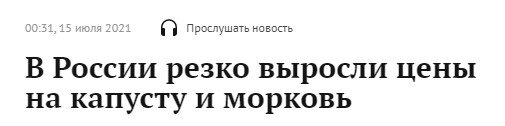Росстат опубликовал данные по динамике цен на разные виды товаров и услуг с 1 января по 12 июля 2021 года. Самым шокирующим оказался рост цен на некоторые овощи. Так, например, больше всего подорожала морковь: индекс изменения цены с начала года составил 251,89%, то есть, удорожание в 2,5 раза! Далее в антирейтинге следует белокочанная капуста - за полгода изменение цены составило 188,69% - удорожание на 89%, практически в 2 раза. Недалеко ушел и картофель - индекс изменения цены на него с начала года составляет 180,42% - картошка подорожала на 80%. Удорожание репчатого лука составило 35% за полгода. Цены на помидоры и огурцы снизились, соответственно, на 25% и 40%. Рост цен на самые популярные овощи на десятки и даже сотни процентов к разгару овощного сезона - это уже не смешно. Даже в сравнении с предыдущей датой подсчета (неделю назад) морковь выросла в цене на 5,4%, а капуста - на 3,6%. Тем временем, наша правящая партия только собирается предложить меры по сдерживанию цен на пресл