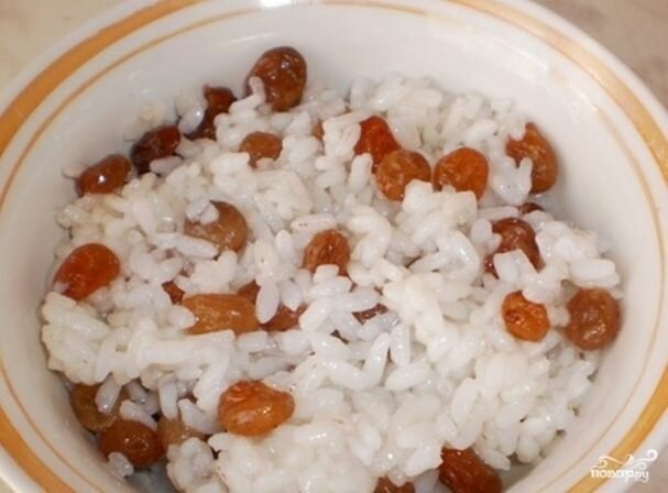 Засыпьте в кипящюю воду полстакана риса, горсть изюма, немного сахара и, помешивая, говорите:
