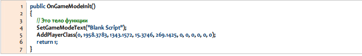 Давайте проверим наш пример в действии. Вызовем функцию из функции OnGameModeInit. Для этого вышеуказанный код помещаем в тело данной функции как показано на примере ниже: