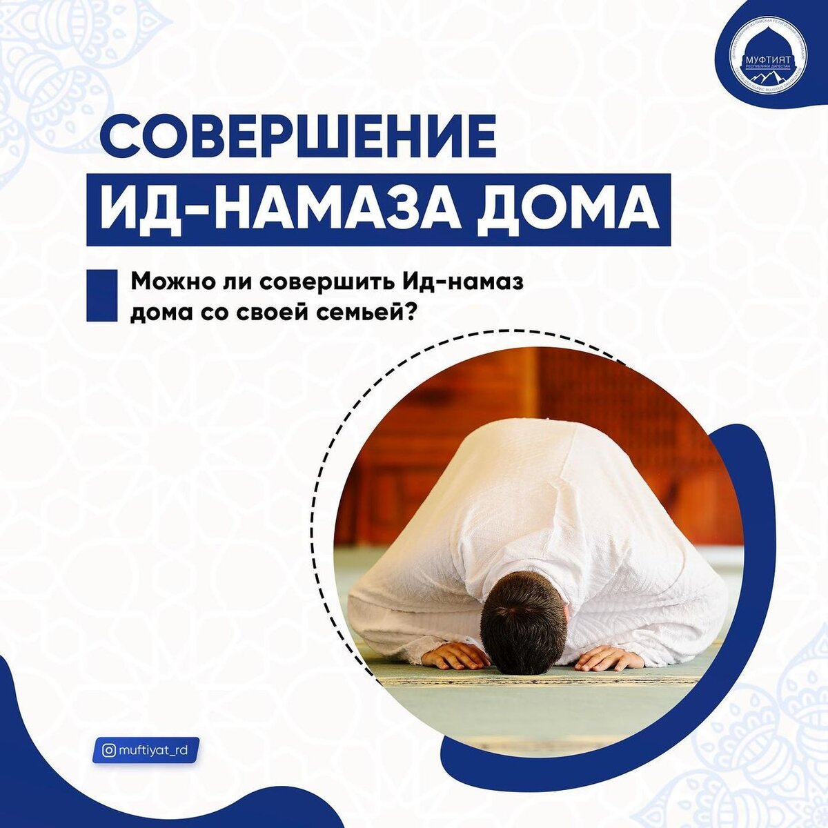 ⠀ #Вопрос: Можно ли совершить Ид-намаз дома со своей семьей? ⠀ #Ответ: Молитва ‘Ид аль-азха является настоятельной сунной как для мужчин, так и для женщин, и желательно его совершить мужчинам коллективно в мечети, а женщинам дома. Время совершения намаза наступает с восхода солнца (очень желательно совершить через 15 минут после восхода) до зенита первого дня курбана. Ид-намаз можно совершить и индивидуально. (Следует отметить, что ввиду сложной эпидемиологической обстановки в регионе Муфтият РД настоятельно рекомендует совершить Ид-намаз дома коллективно с семьёй, чтобы уберечь себя и свою семью от болезней.) ⠀ Порядок совершения Ид-намаза: ⠀ Намаз состоит из двух обычных ракаатов. При вступлении в намаз намерение делается следующим образом: «Я намереваюсь совершить двухракаатный желательный Ид-намаз (коллективно) ради Аллагьа». После вступительного такбира желательно читать «Важагьту» (кто знает). Затем семикратно читают такбир «Аллагьу акбар» и между каждыми двумя такбирами ре