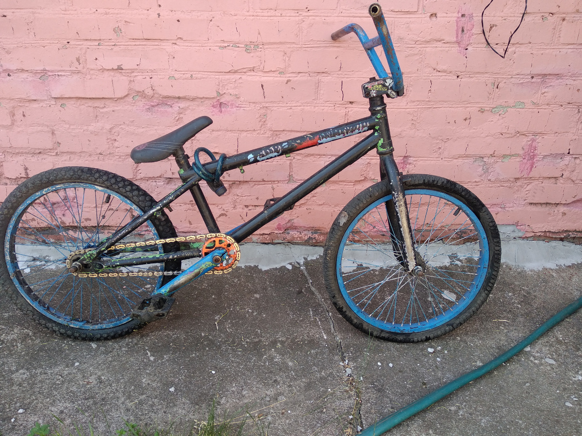 Покраска велосипедов (BMX) ПЛАН 1. Очистить от старой краски Это можно сделать с помощью балгарки со специальным диском, после нее советую пройтись по всем местам наждачной бумагой Таким BMX был: Таким BMX стал после работы с балгаркой и наждачкой 2. Следом закрываем пищевой плёнкой те места велосипеда где нам не нужно красить, И ОБЯЗАТЕЛЬНО ОБЕЗЖИРИТЬ ВСЮ ПОВЕРХНОСТЬ ТРЯПОЧКОЙ ОБМОЧЕННОЙ В БЕНЗИНЕ 3. Следующий этап нанесения грунтовки на все части велосипеда 4. После нанесения приступаем к покраске Результат