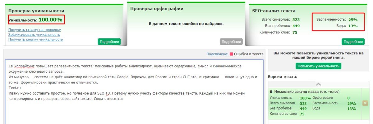 У начинающего копирайтера возникают проблемы. Выходит заспамленность и много ненужной воды, а по другому ненужных слов. Проблема распространенная и легко решаемая. Давайте разбираться. Заспамленность в тексте Заспамленность - это постоянно повторяющиеся слова, что мешают для SEO-продвижения сайта и устройства на работу копирайтером. Заспамленность выражается в процентах и если поле стало красным, то придется переделывать, удалять, и менять структуру предложения. Если цвет стал желтый, то это середина. Ориентируйтесь на график ниже: Вода в тексте Вода в тексте набирается от пустой информации. Когда количества ненужных слов перевешивает норму и все превращается в то, что читатель тратит время попусту. Плюс из-за этого сайт вряд ли выйти в топ десять по запросу пользователей. Нормальным количеством воды считает 15% - 20% процентов. И если антиплагиат найдет воду, то отметит голубым цветом. Избавится от нее легко, уберите или замените выделенные слова и предложения. Вывод Чем больше
