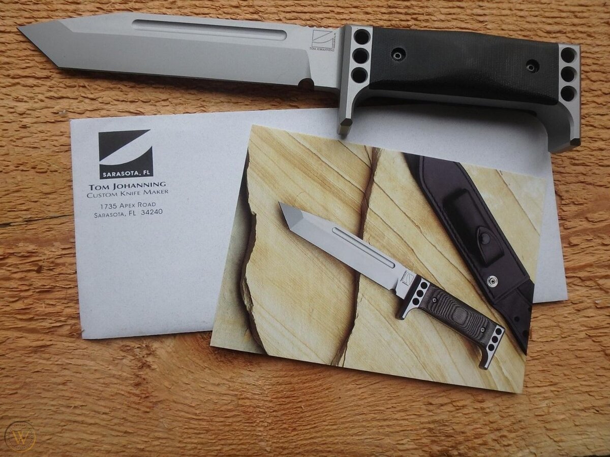 Нож о котором пойдет речь ниже изготовил Том Йоханнинг. Его целью было создать надежный, крепкий инструмент, который способен выдержать серьезные нагрузки. Цельнометаллическая конструкция, форма клинка по типу американского танто, два больших дола значительно увеличивают прочность. Том сделал выбор в сторону стали A-8. Эта сталь отличается отличной ударной вязкостью, для защиты от коррозии клинок покрыт оксидом алюминия, поэтому поверхность не дает бликов на солнце. Клинок имеет твердость 57-59 RC, лезвие подвергается криогенной термообработке. Вес ножа почти 400 грамм, центр тяжести смещен ближе к рукояти. Рукоять почти прямоугольная, хоть немного и имеет бочкообразнаю форму. Накладки сделаны из микарты и крепятся двумя стяжками. Нож имеет довольно развитый упор и навершие. Они надежно защитят руку от попадания на лезвие. Упор и навершие имеют довольно угловатые формы, что может вызывать неудобства. В комплект поставики входят ножны изготовленные из кожи, с возможностью носить нож на