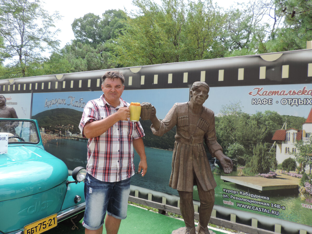 Уже при въезде нас встретили интересные персонажи. Фотосессия со знаменитой троицей платная, 100 руб. Предприимчивые жители даже футболки с рекламой изготавливают. Бизнес. Проехались по селу. Ухоженно и красиво. Улицы, близкие к набережной очень похожи на европейский стиль. Цель нашего приезда в Кабардинку совпадает с желанием многочисленных туристов. Не просто искупаться в море, а посетить Старый п