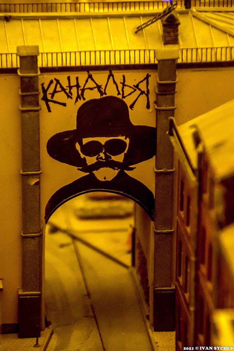 В сегодняшнем обзоре я решил вернуться к московскому макету-музею со скромным названием "Царь-макет". В комментариях просили указать где он находится, и, хотя он легко ищется в поисковиках, дам адрес: Москва, ул.Константинова, 11А. Ссылки на все предыдущие "серии" рассказов об этом макете в самом низу сегодняшнего обзора. И сегодня будет нарушена традиция с упоминанием железных дорог, сегодня о всяких маленьких, порой незаметных, элементах этого макета. Кстати, многое я пропустил, так что не стесняйтесь добавлять в комментарии, быть может в следующий визит буду искать эти сценки специально. 1. Наверное, самой заметной отсылкой к известному человеку, самой очевидной "пасхалкой" является изображение самого известного петербуржца вна стенах одного из дворов-колодцев в макетном Санкт-Петербурге. Правда, Михаил Сергеевич здесь не очень похож на себя, но сочетание Санкт-Петербург+усы+очки+шляпа так и заставляет произнести: "Тысяча черррртей!" 2. Отдельная витрина, в районе Волгограда, видимо