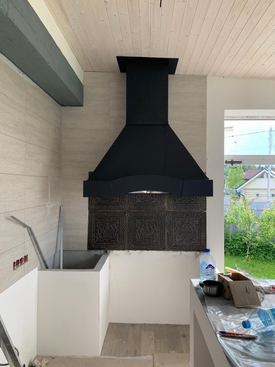 Вытяжной зонт над барбекю в закрытой беседке.