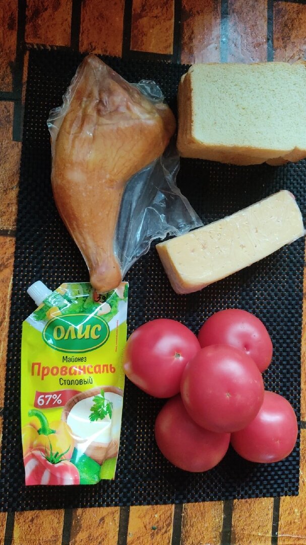Привет, мои друзья и подписчики! Давненько я не писала. Совсем мне времени!!!! То отпуск, то поездки, то гости. Ни на что нет времени. Готовить не успеваю, не то что статьи писать!!! Сейчас очень жарко. Мои домашние совсем отказываются есть. Так и до истощения недалеко! Поэтому придумала один очень простой и сытный салат. Готовится очень быстро, но в тоже время он такой сытный. Моей семье он очень понравился! Попробуйте и вы! ДЛЯ САЛАТА НАМ ПОНАДОБИТСЯ: Помидоры - 600 гр. Сыр - 250 гр. Курица копченая - 300 гр. Сухарики - 100-150 гр. Майонез - 80 гр. Я не очень люблю покупные сухари, поэтому готовлю их сама. В мой салат я добавлю как раз свои сухарики. Вы же можете использовать те, которые нравятся вам. Перед приготовлением салата займемся сухариками. Берем несколько кусочков хлеба и нарезаем их на кубики. Нарезанный хлеб отправляем в духовку, нагретую до 100 градусов. до тех пор, пока не подсушится. Пока сухарики сушатся, я сняла с копченого окорочка кожицу. Отделила мясо от кост