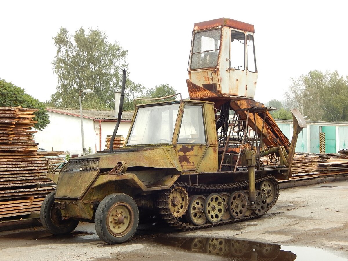 Списанный немецкий полугусеничный тягач превратили в погрузчик для пиломатериалов