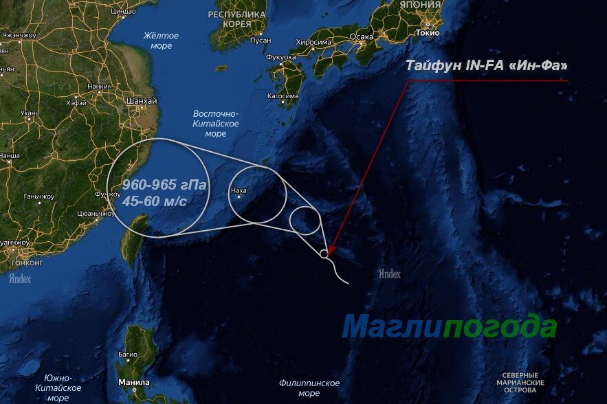 9 июля в очередном прогнозе для Приморья была опубликована предварительная информация о возможном появлении тайфуна в Тихом океане: На данный момент предполагается появления нового тайфуна примерно после 15 июля. 15 июля информация была подтверждена: возможно уже завтра появится очередной тайфун. В случае зарождения тайфуна будет сделана отдельная публикация и примерная траектория тайфуна. Теперь все подтвердилось! 16 июля в Филиппинском море Тихого океана произошло зарождение 6 по счету тайфуна этом году. Тропический циклон зародился в океане с координатами 17,4° с.ш., 134,7° в.д. Сегодня 18 июля и тропический циклон развился до тропического шторма. Ему присвоили имя IN-FA «Ин-Фа». Тропический шторм медленно двигается на северо-запад. По данным на сегодня утром, IN-FA находился в точке с координатами 22,2° с.ш., 132,6° в.д. Давление постоянно снижается и сегодня составляет 998 гПа, ветер в шторме пока 18 м/с, порывы до 25 м/с. Вихрь медленно двигается на северо-запад. 19 июля Ин-