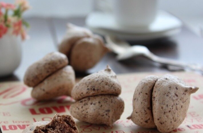 Добавить просеянное какао, перемешать. Какао лучше использовать проверенное, хорошего качества. Добавить к белковой массе натертый шоколад, аккуратно и быстро перемешать лопаткой методом складывания, сверху вниз. Полученную массу выложить в кулинарный мешок и отсадить на противень в виде небольших печенек, размером с пол грецкого ореха.