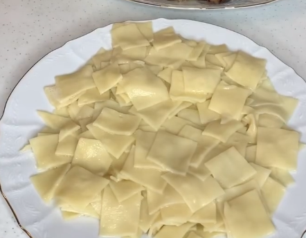 Далее тесто делим на 2 части и раскатываем в тонкий пласт. Этот пласт нарезаем на квадратики.