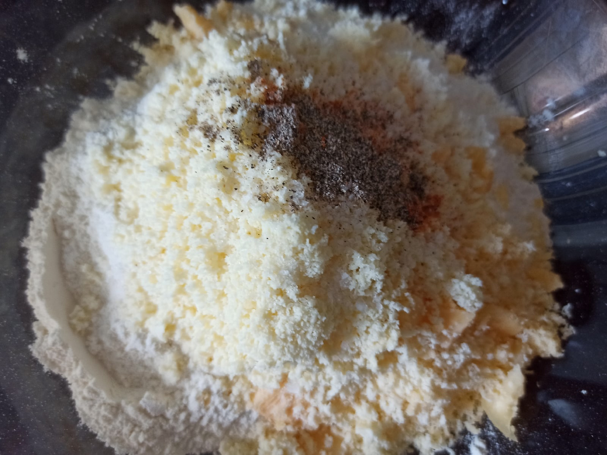 В емкость для теста высыпаем 6 столовых ложек пшеничной муки, 200 грамм тертой на мелкой терке брынзы, 50 грамм тертого твердого сыра и немного твердого сыра, нарезанного мелкими кусочками (я добавил тертый Тильзитер и нарезанный Ларец) , 0,5 чайной ложки соли, красный и черный перец.